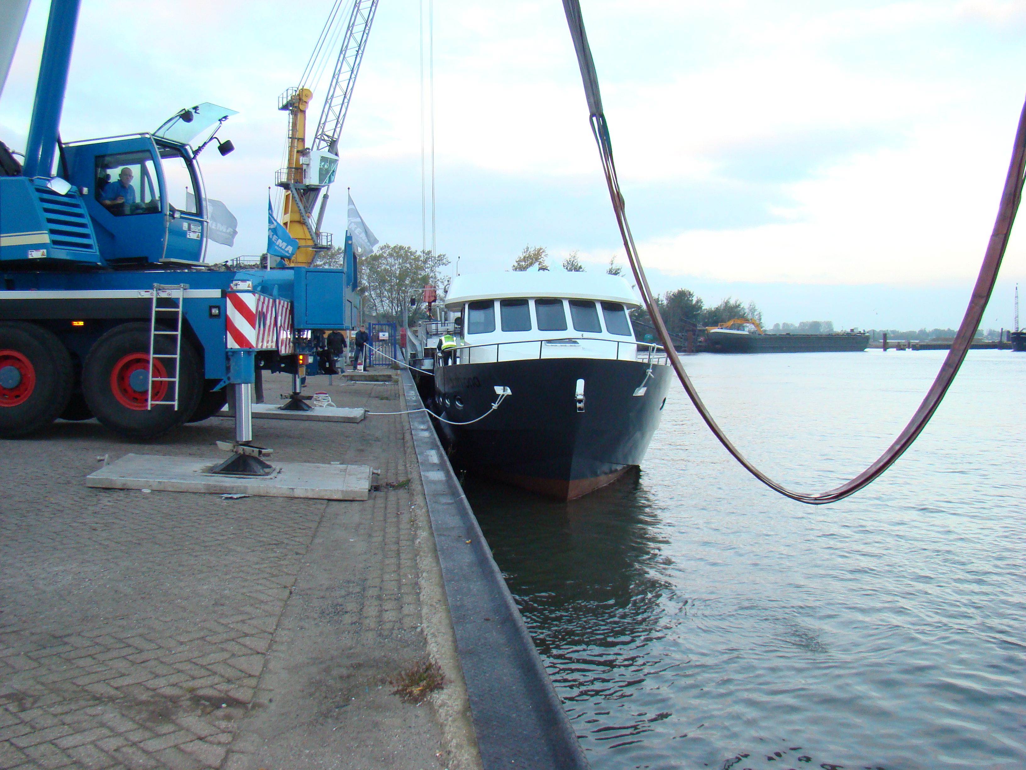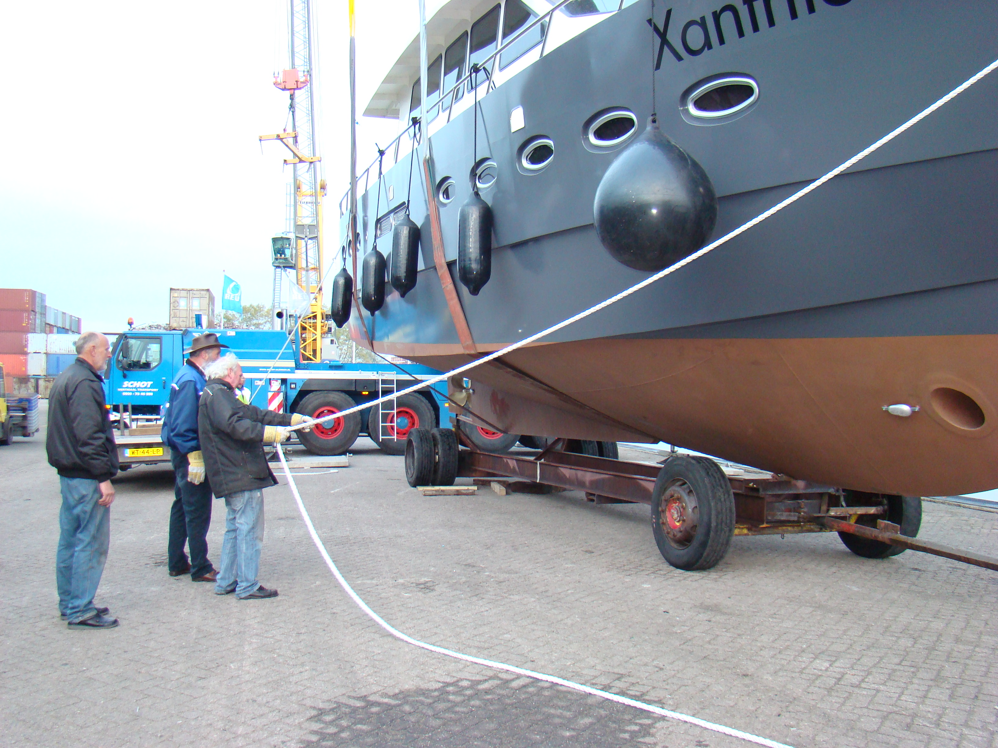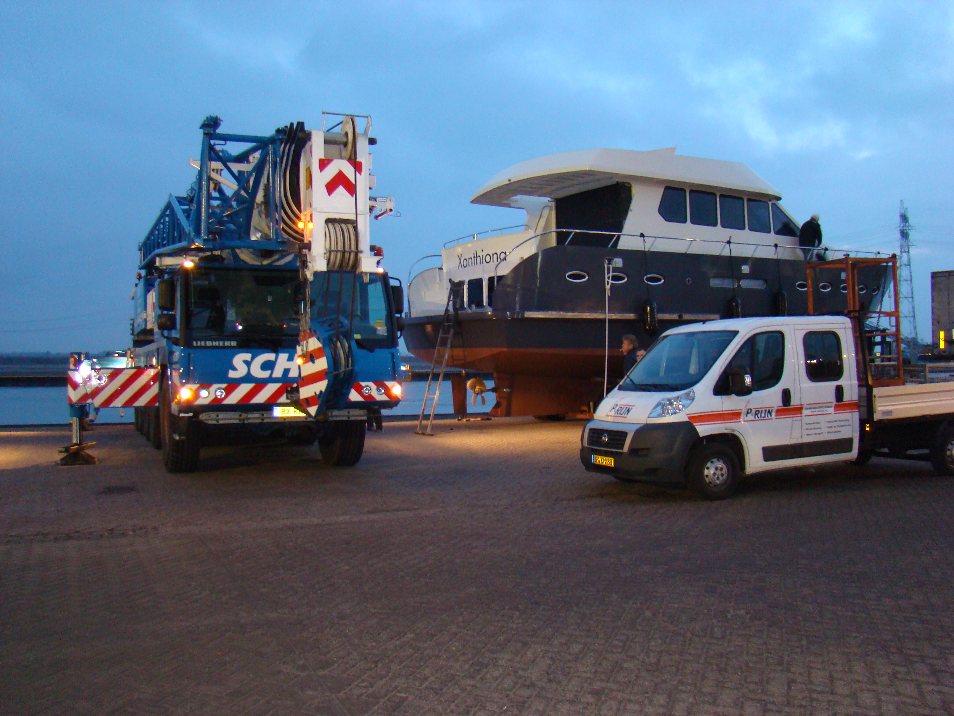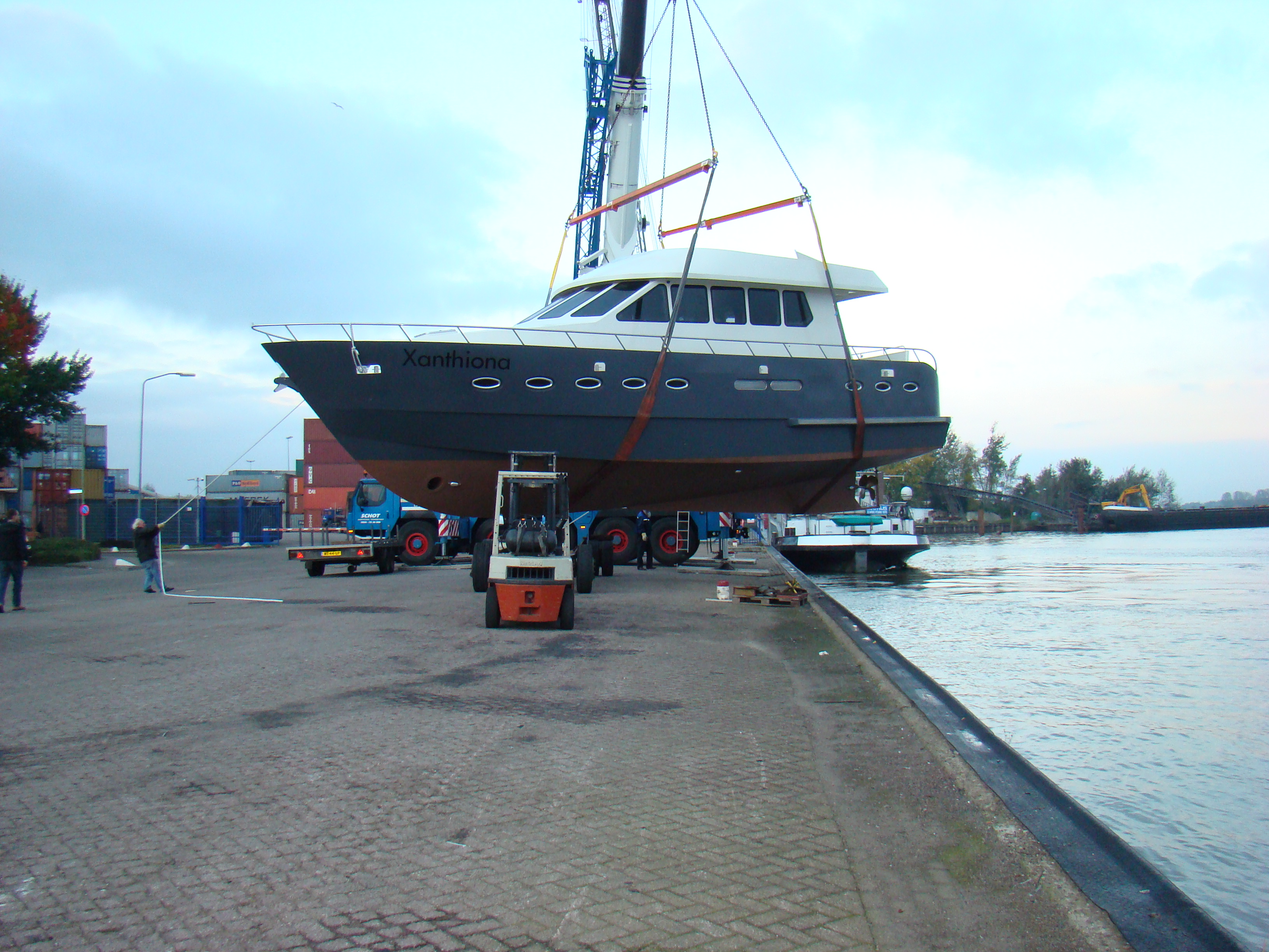 De bouwlocatie op het industrieterrein in Hardewijk, was ca. 1 km van het water en de Xanthiona ging daarom dinsdagavond al over de weg om druk verkeer te mijden. In de industriehaven werd de Xanthiona op woensdagochtend door een mega-kraan in het water getild. Zie bijgaande sfeerplaatjes (klik op de foto voor een vergroting).