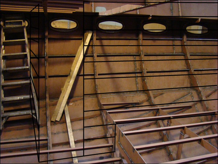 Naarmate de bouw van de Xanthiona vordert, beginnen ook de ideeen omtrent het interieur steeds meer definitieve vorm te krijgen. Bij het laatste bezoek afgelopen zaterdag zijn de diverse ruimtes enigszins opgemeten en vergeleken met de eerdere ontwerpen van het interieur. Het ontwerp van de salon en keuken is nog zoals oorspronkelijk bedacht, maar beneden is het inmiddels iets aangepast. Ter vergelijking het oorspronkelijke interieur beneden door de ontwerper van de Almarine 1700 en mijn laatste gedachtes voor de Xanthiona.