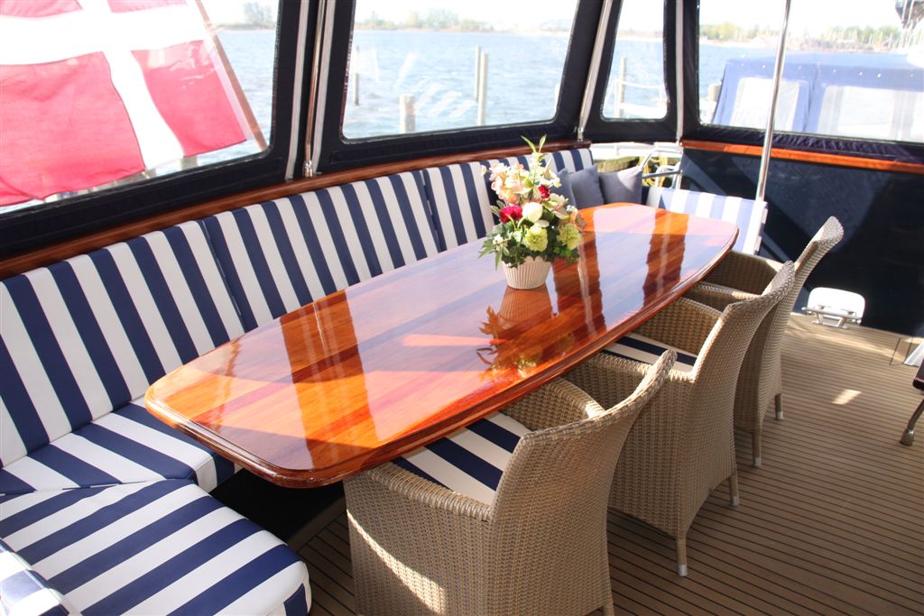 Een lekker ruim achterdek biedt maximale flexibiliteit: dus geen vaste bank. Maar bij slechter weer geeft een vaste bank en semi-vaste tafel meer hou vast. Wat is mooier? Mijn echtgenote geeft de voorkeur aan de vaste bank. Zelf weet ik het nog niet. Maar om er niet helemaal ‘jouw’ boot van te maken, gaan we dus voor een fraaie bank met dito tafel op het achterdek, nu wordt het ‘onze’ boot.