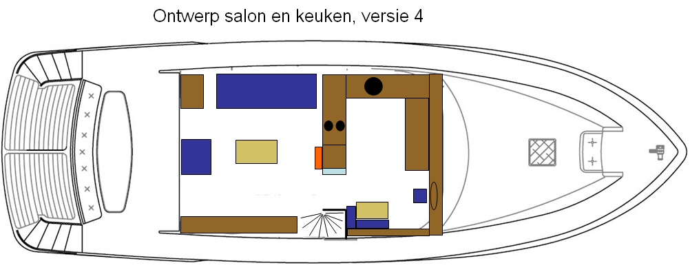 Af en toe kijk ik wel eens op een verkoopsite van boten om wat ideeën op te doen voor het interieur. Toevallig zag ik een goede suggestie vandaag. Hieronder zie je het laatste ontwerp van het interieur beneden. In vergelijking met vorige ontwerp had ik in de grote gastenkamer eerder al extra slaapmogelijkheid gecreëerd. Door in deze kamer een soort slaapbank constructie te maken, is er een zitbank als er slechts 2 gasten slapen. Met de zitbank als slaapbank kan een stel met een kind of 3 vrienden/vriendinnen ook in deze kamer terecht. Door nog een wegklapbaar bed (als dat lukt) boven de zit/slaapbank te maken kunnen er misschien wel 4 slapers in.