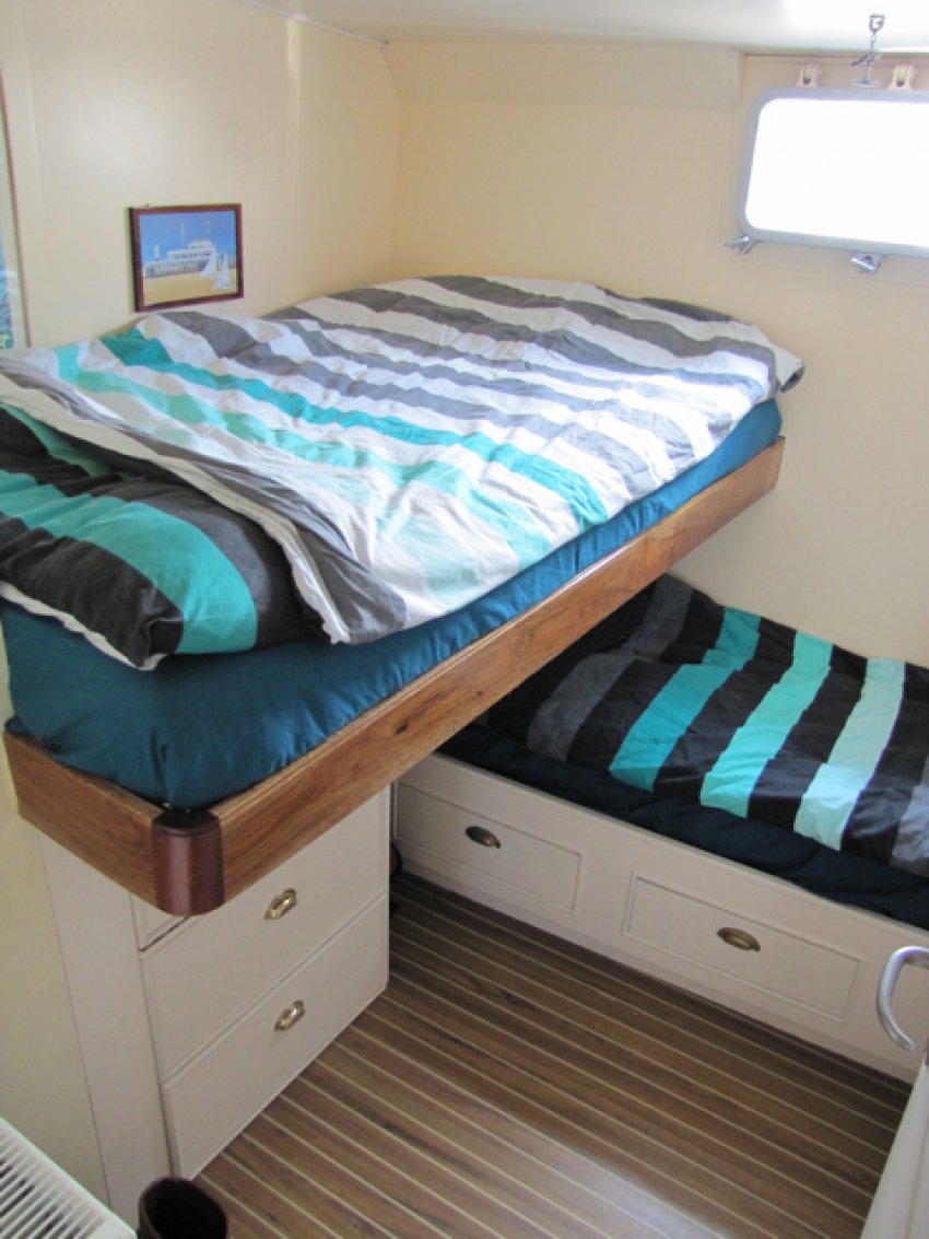 Beneden moet er bij de verhoging in de voorkajuit een trede worden uitgesneden en ingelast om te voorkomen dat je je hoofd stoot als je naar de grote rechtse en de kleinere linkse voorhut gaat.