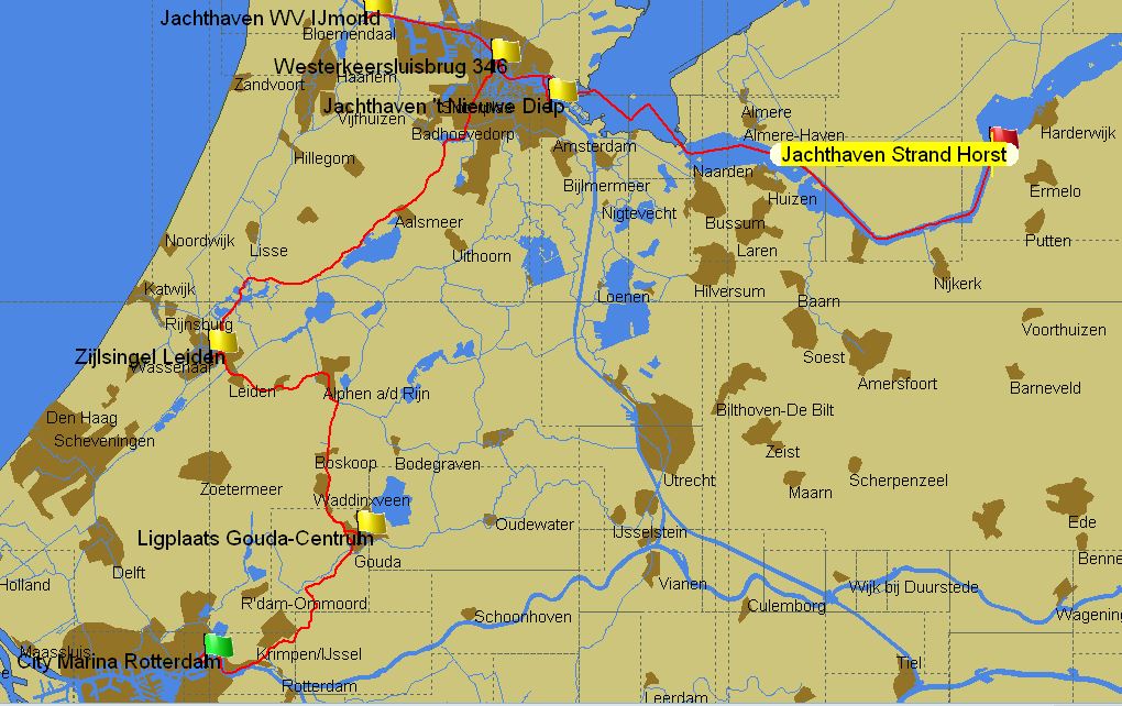 Tot nu toe gebruik ik PC-Navigo en dat bevalt goed. PC-Navigo heeft veel mogelijkheden en en voor mij is de route-planning het belangrijkst. Op basis van hoogte, breedte en diepgang kan PC-Navigo de vaarroutes van punt A naar punt B berekenen. Met de breedte van 5.50 meter en een hoogte van 7.00 meter (met antennes neer: 6.05, met radarbeugel neer: 5.40) kan ik met de Xanthiona lang niet overal varen. Route planning is dus essentieel. Ook kun je met PC-Navigo tussengelegen aanlegplaatsen opgeven, zodat niet alleen de kortste route wordt berekend, zie bijvoorbeeld vorig bericht, waarbij we via Leiden en Haarlem terug varen naar Strand Horst en niet via de kortste route via het Amsterdam-Rijnkanaal.