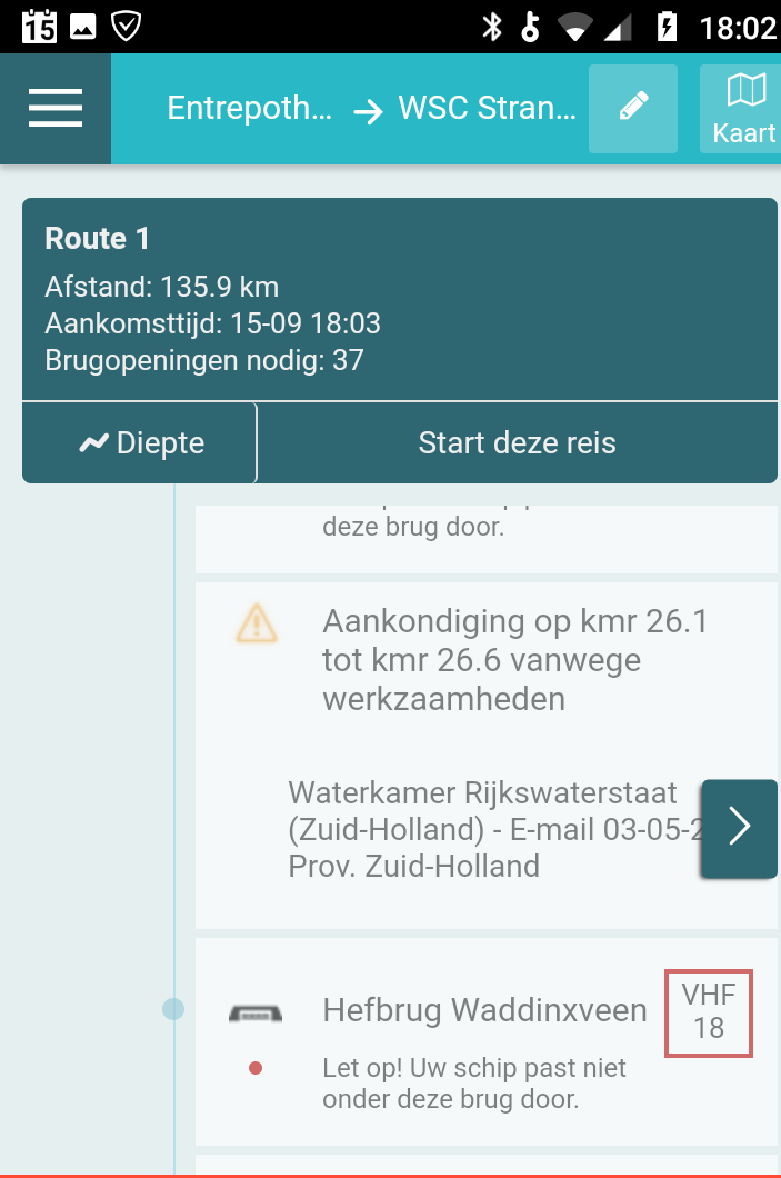 Riverguide zou op basis van de meest actuele data hetzelfde moeten doen, echter helaas waren onze ervaringen met Riverguide niet goed. Op zich lijkt het een aardige app, geinstalleerd op een Android telefoon, biedt het de mogelijkheid een begin- en eindpunt van een route in te voeren. Het houdt ook rekening met de afmetingen van het schip en zou dus op basis van de actuele stremmingen een route moeten berekenen.