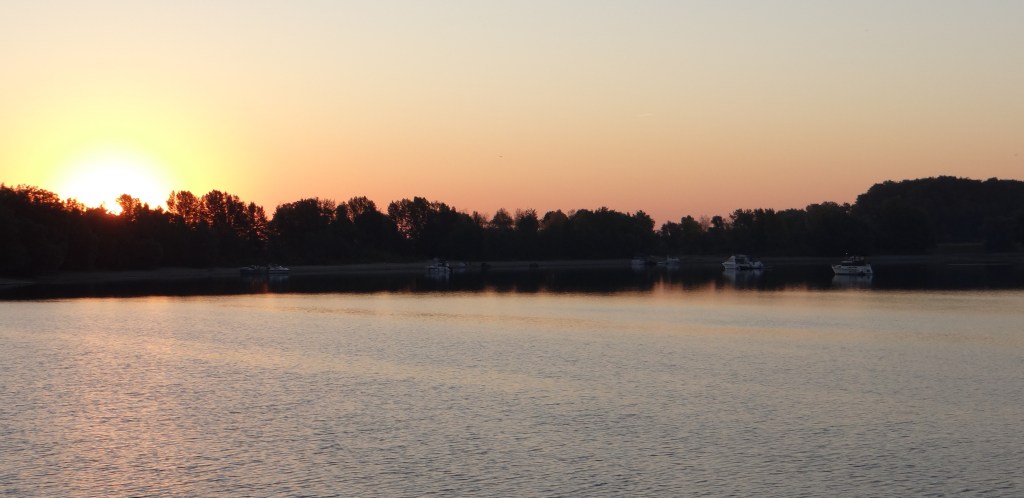 In Lathum heb ik nog geprobeerd een aantal havens te reserveren op weg naar Maastricht, maar geen geluk. Als alternatief nog een poging gedaan om te reserveren bij Eiland van Maurik en dat lukte voor 5 dagen. Hierna ook maar afgezien om Maastricht nog te bereiken. En dus terug gevaren via de Gelderse IJssel en de Lek naar Maurik. Ondertussen was het prachtig weer met een voorspelling van 36 graden. Om de hitte te vermijden ’s ochtends om 6 uur vertrokken. Geweldig varen is dat, glad water, heerlijk rustig en vooral stille natuur en een mooie licht inval. Met de stroom tegen varen we ca. 9 km/uur.