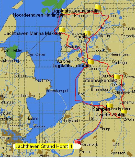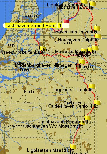 Vanuit Strand Horst via Amsterdam, Amsterdam Rijnkanaal, Lek, Arnhem, Nijmegen, Maas, Venlo, Roermond, Maasbracht naar Maastricht en via de Gelderse IJssel terug was het nieuwe plan. Een route van ca. 700 km. Op de 1e avond in Weesp aangekomen werd het door een aantal schippers nog eens bevestigd, Friesland lag vol: Sneek, Terherne, Grouw, Fluessen en lange wachttijden bij de sluizen. Een enkeling wist te vertellen dat de Friezen er zelfs genoeg van hadden en Friesland ontvluchtten met hun boot.