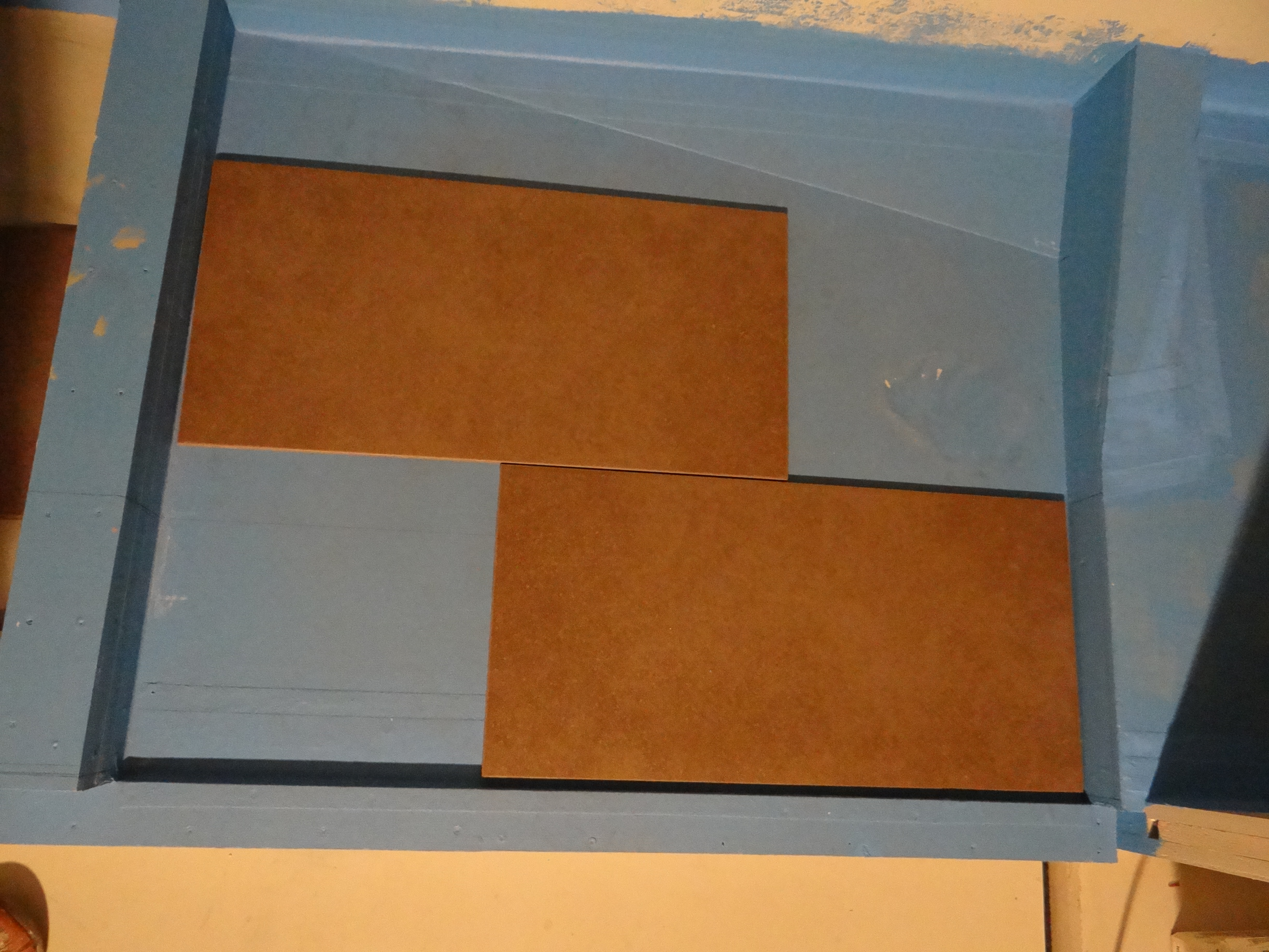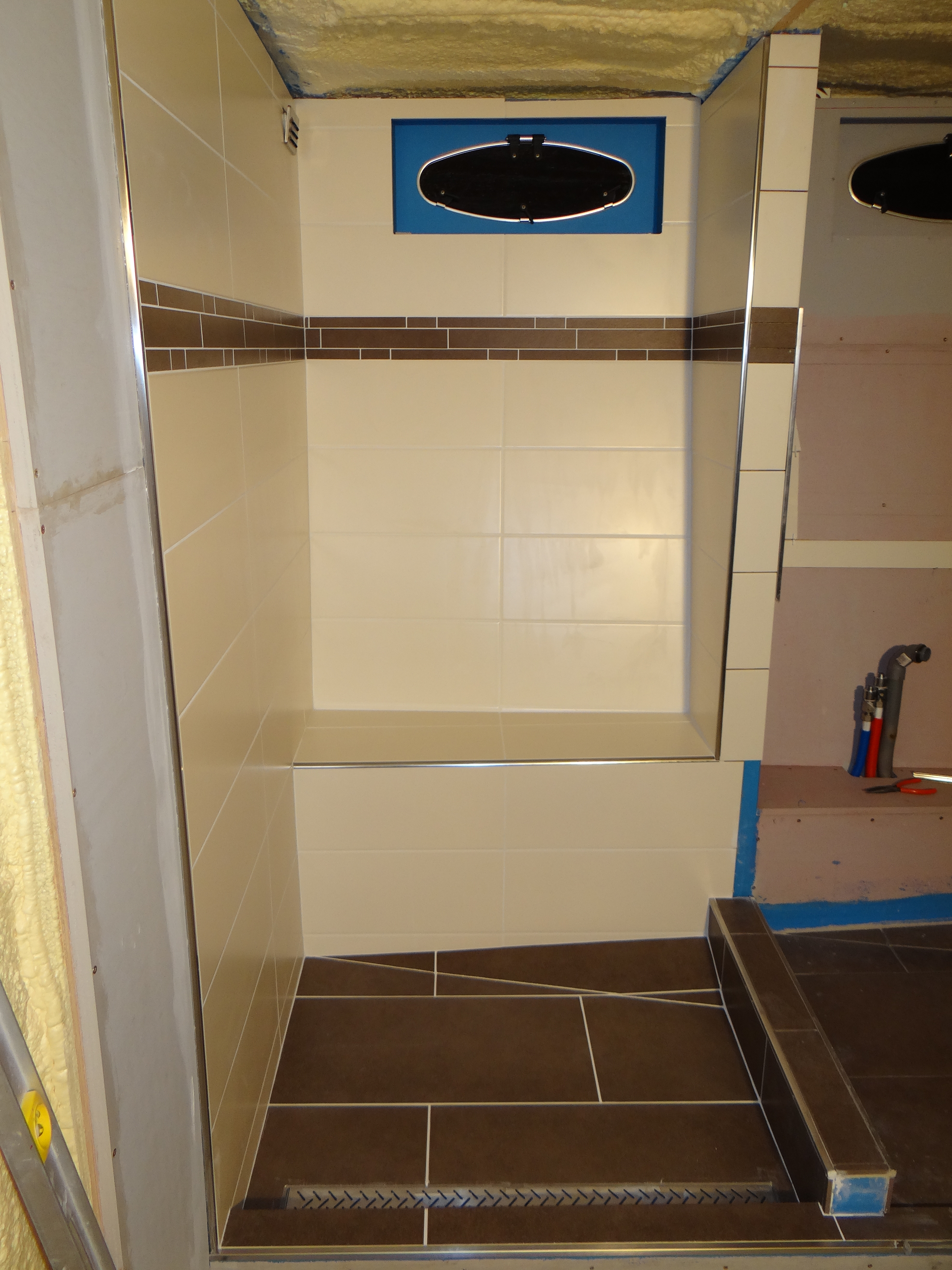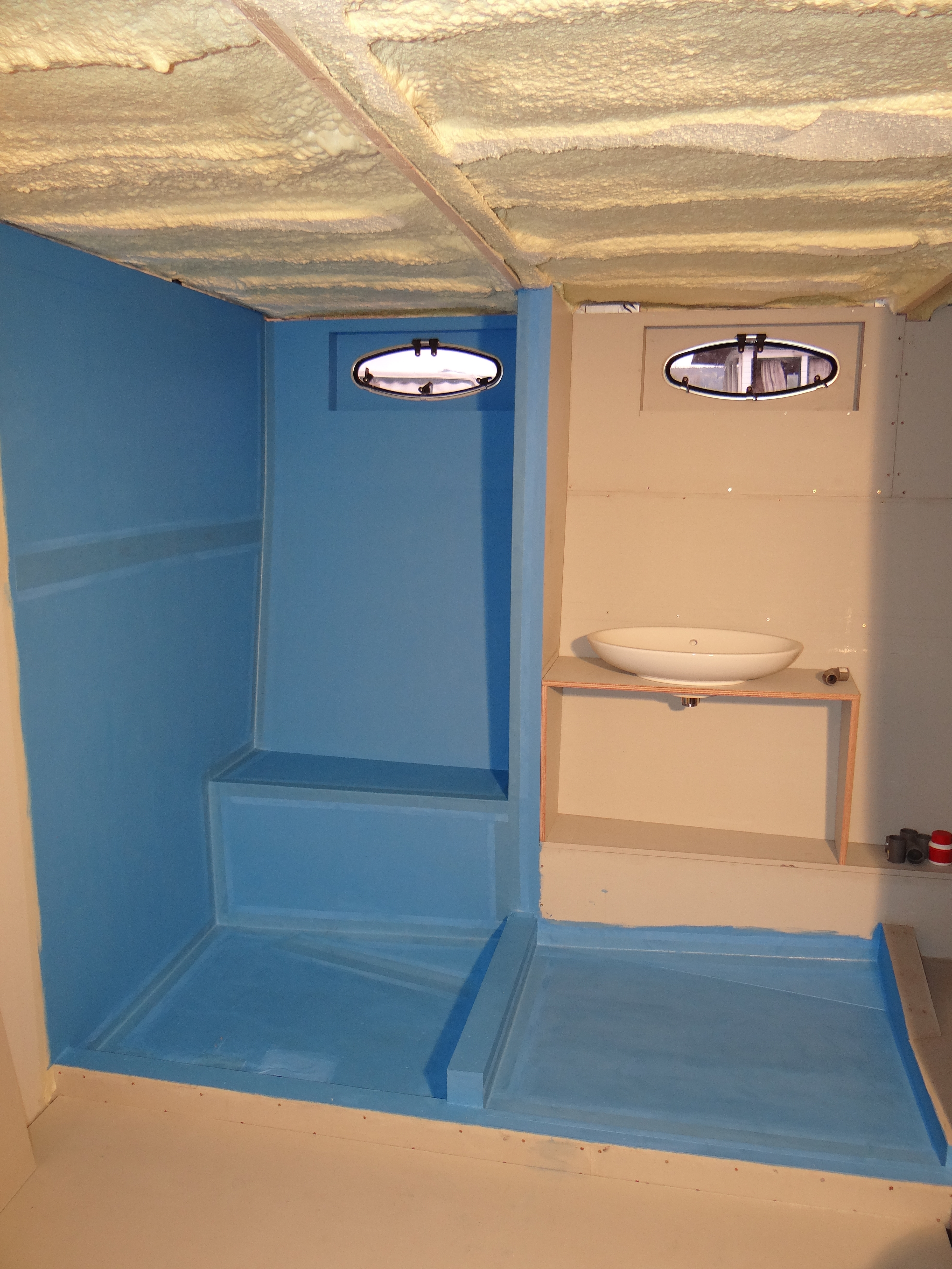 De wanden en vloeren van de badkamer in de achterkajuit zijn ingesmeerd met een speciale waterdichte rubber laag. Dit om te voorkomen dat er water achter de tegels komt en het multiplex indringt. Het product van Knauf (duschdicht) komt met een speciale band voor in de hoeken om ook scheuren te voorkomen.