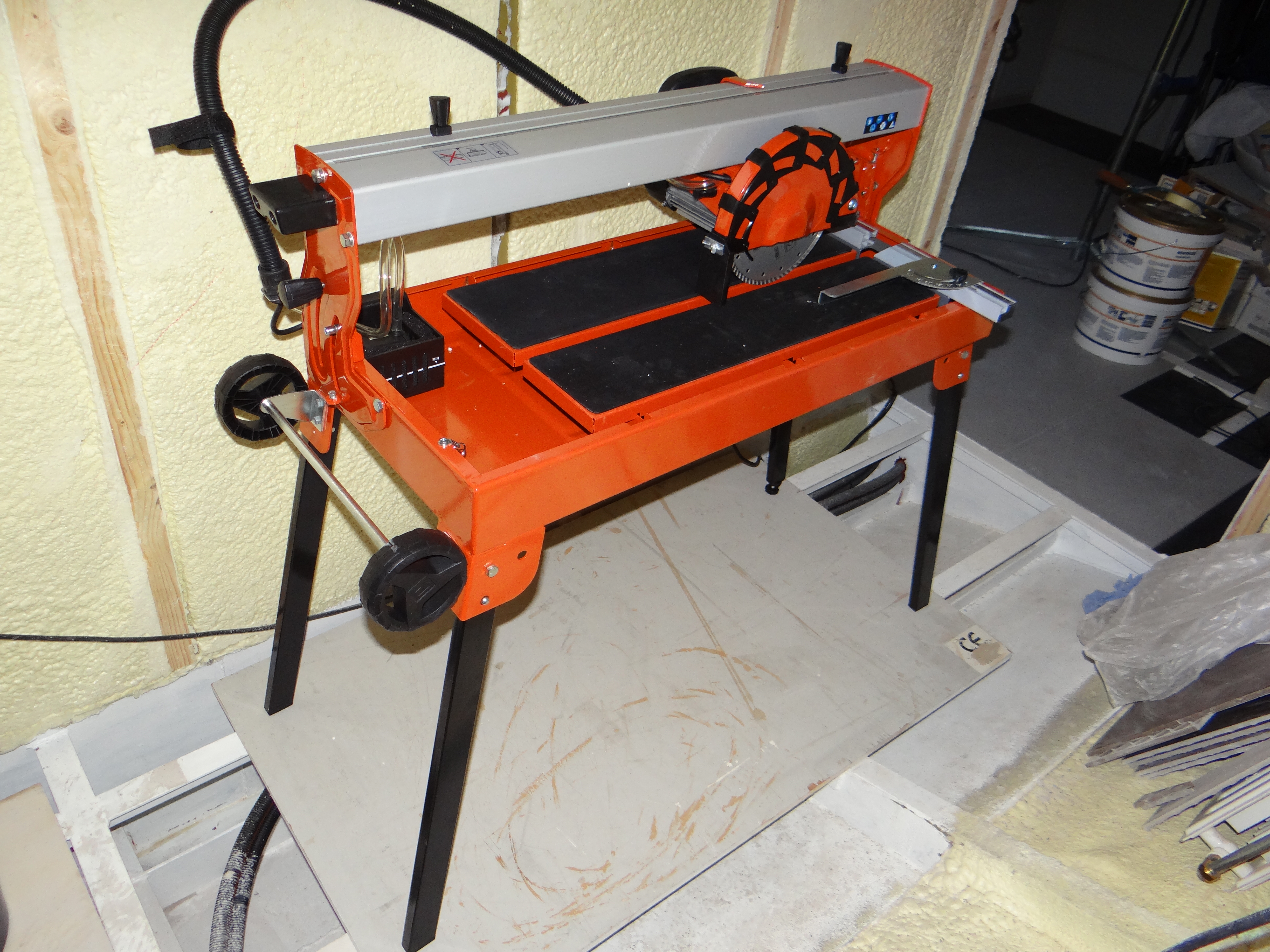 Na het lezen van wat reviews was het me duidelijk, de 100 euro was weggegooid geld en voor een flink betere machine kwam ik op minstens 260-300 euro uit. Puntje bij paaltje (nog een spreekwoord), ik heb de onderstaande tegelsnijmachine gekocht en dat was een enorme verademing. Je snijdt de tegels met gemak, je kunt tot op een 1/2 mm nauwkeurig zagen, je wordt niet nat gespetterd en nu ik met m’n 4de badkamer bezig ben, realiseer ik me dat ik zo’n betere machine 8 jaar geleden had moeten aanschaffen. Dat had me heel wat ergernis bespaard.