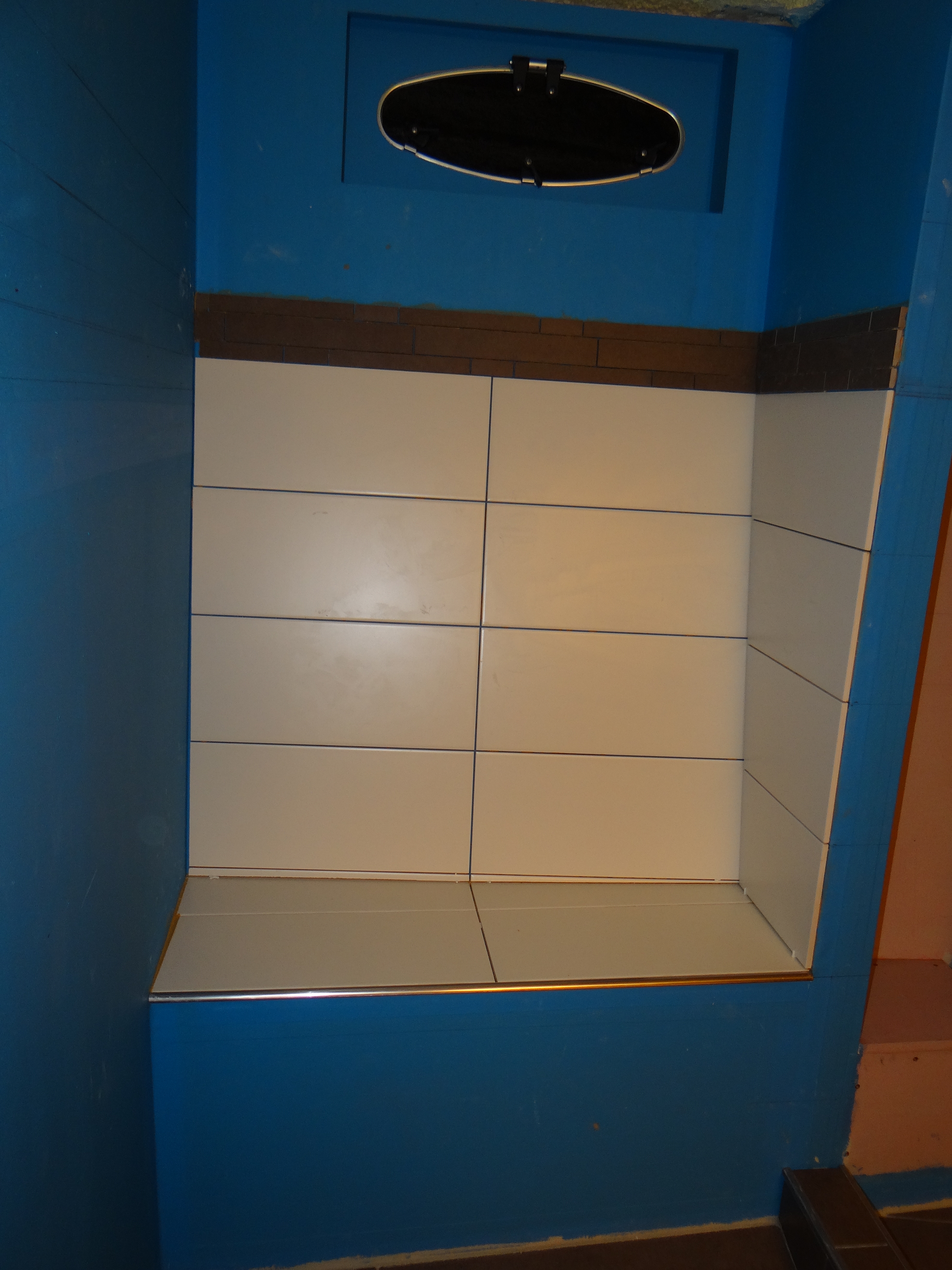 Het betegelen van de 2de badkamer (voor de gasten) ging sneller omdat de wanden nagenoeg recht zijn en per toeval kwam het zo uit dat ik met een hele tegel onder kon beginnen en boven met een hele tegel kon eindigen. Ik hoefde dus weinig tegels op maat te maken. Wel is duidelijk, ook van de betegeling van de badkamer in de achterkajuit, dat hoe groter de tegel hoe meer je de tegels passend moet maken en je hebt dus ook meer verlies.
