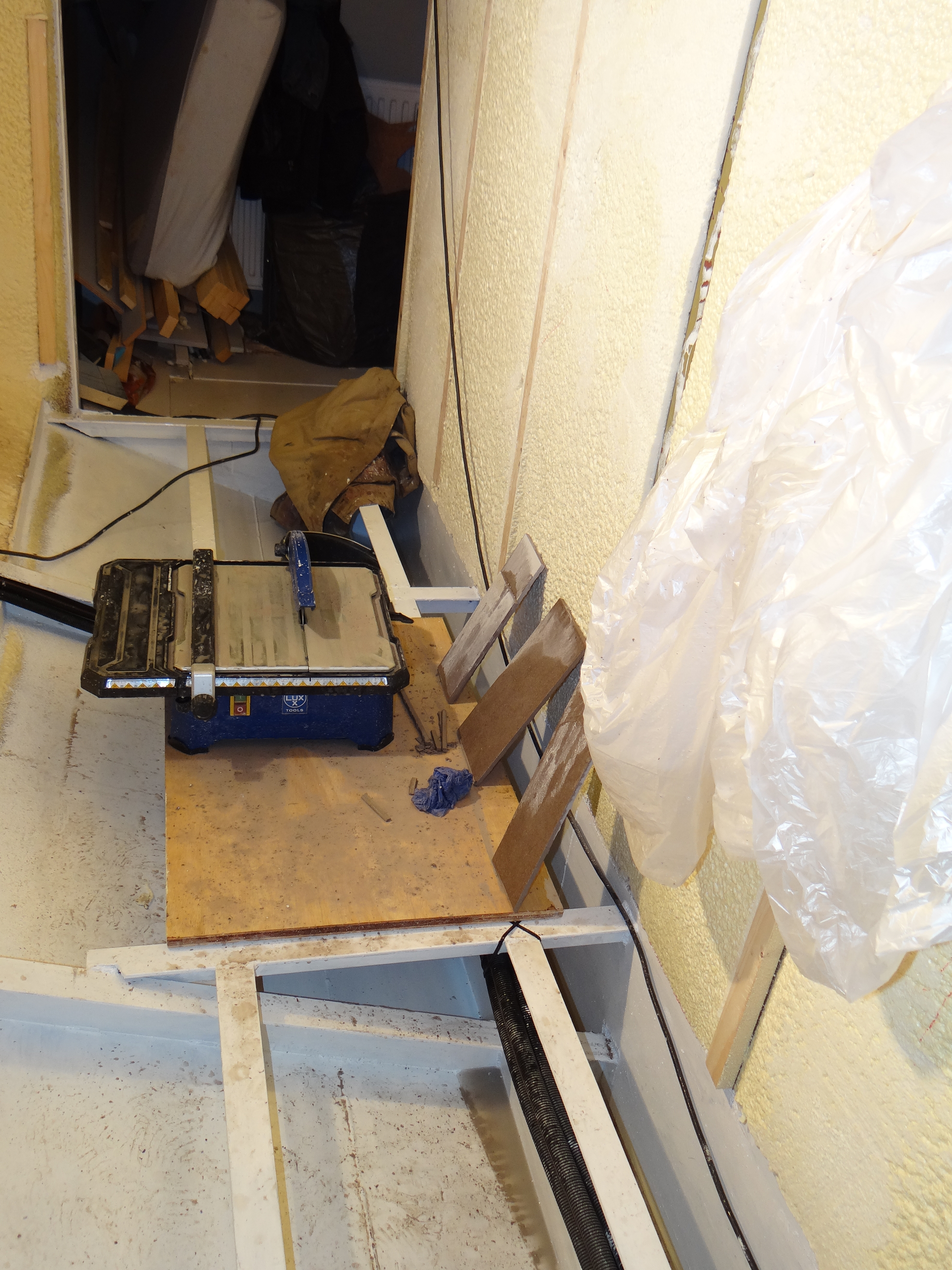 De machine spettert behoorlijk wat water rond en het was noodzakelijk om in de gang een opstelling te maken zodat het water wordt opgevangen en later kan worden wegggezogen.