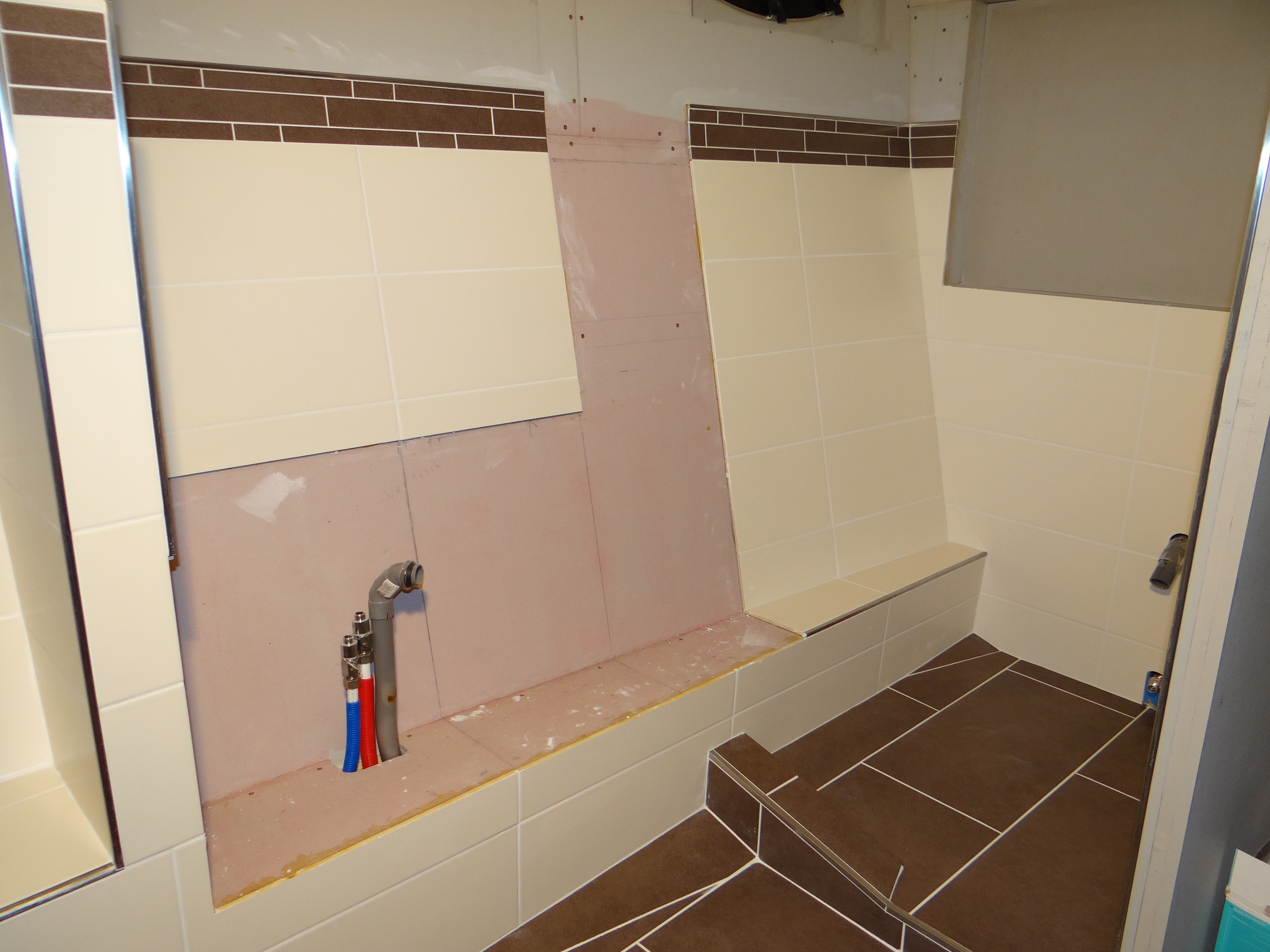 Als laatste is het douchepaneel aangesloten en is het wachten nu op de bestelde douchewand en deur.