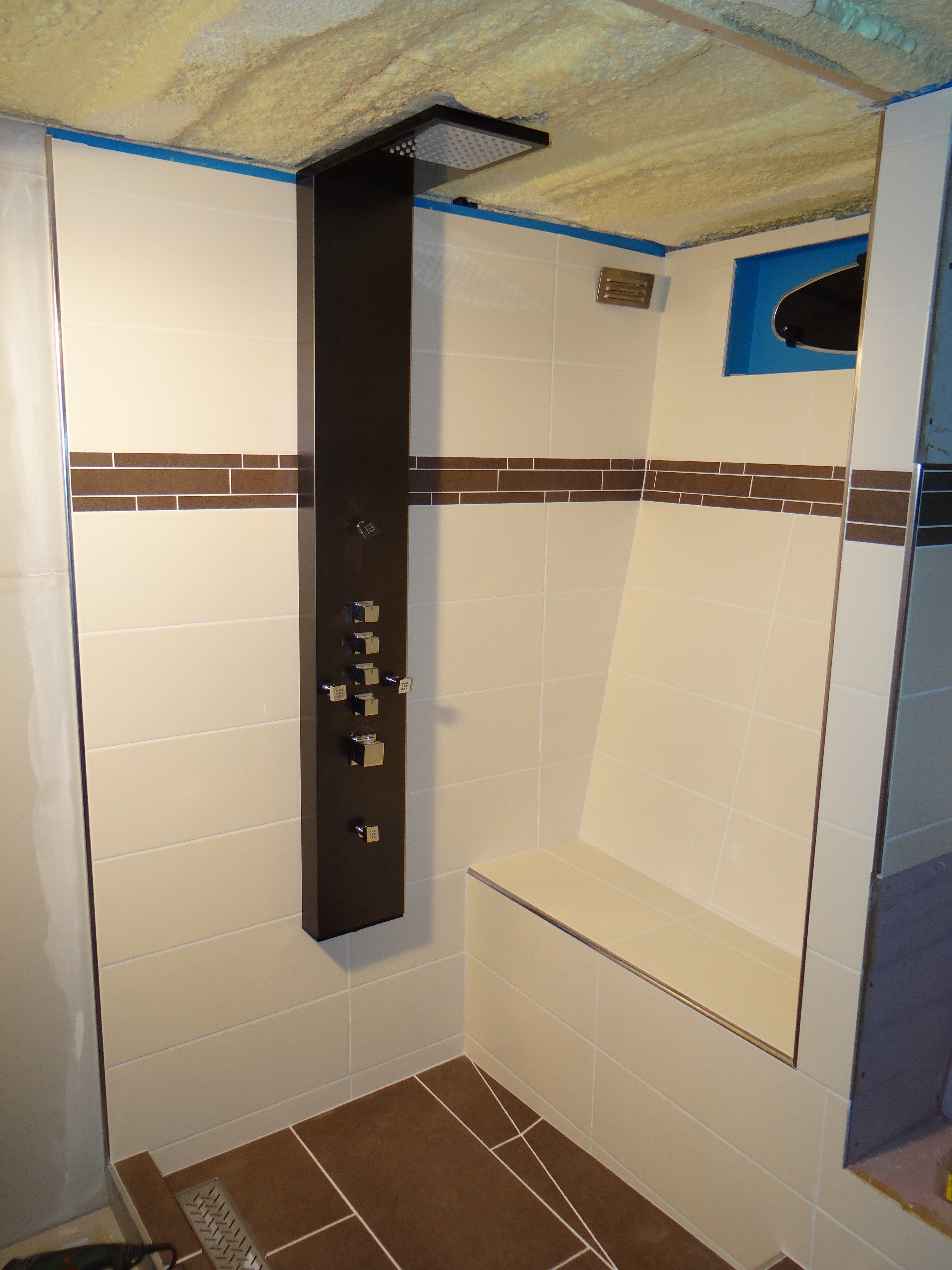 Enfin inmiddels ben ik weer een week verder en zo langzamerhand zitten de meeste tegels er op. Het douchegedeelte is inmiddels ook gevoegd met een witte voeg dat de bruine mozaik tegels heel mooi tot zijn recht brengt.