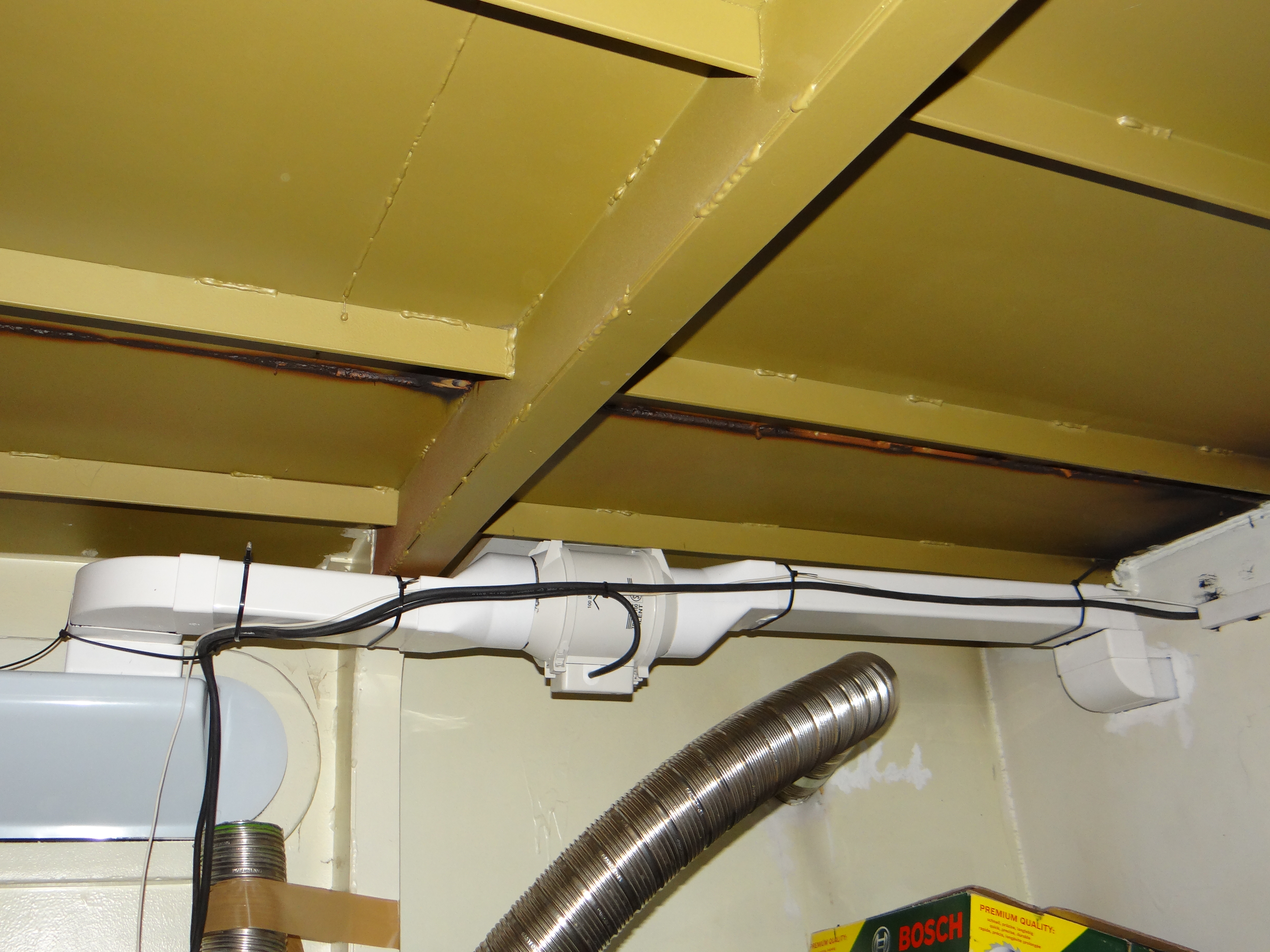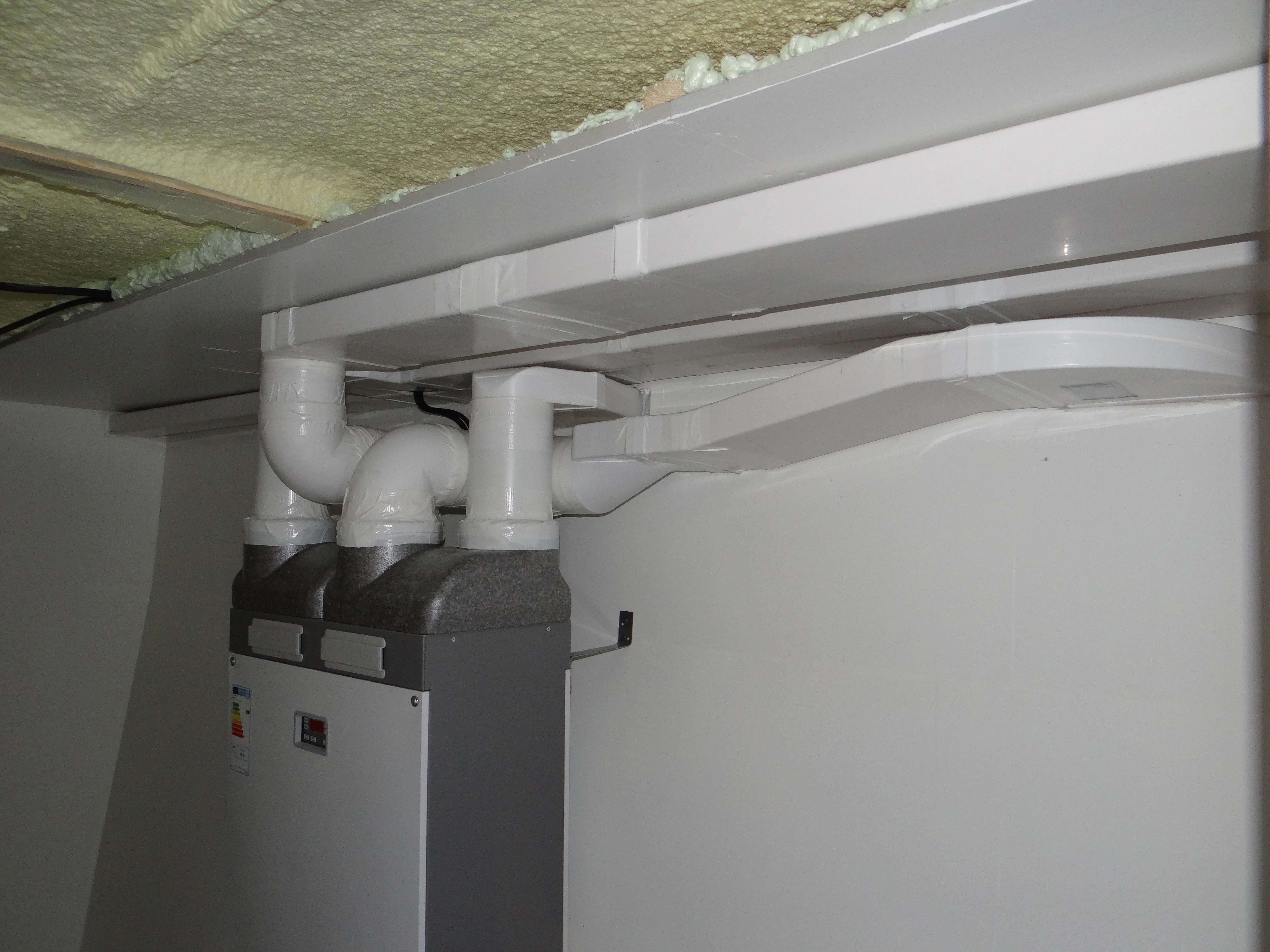 In het vorige bericht (ventilatie gekoppeld aan huisautomatisering) schreef ik uitgebreid over de redenen en achtergrond om een warmte-terug-win (WTW) unit te installeren ter voorkoming van condens en om luchtjes en vocht uit de gastenbadkamer/dagtoilet af te voeren. De WTW is inmiddels geinstalleerd, aangesloten en functioneert zoals verwacht. Het aanbrengen van de luchtkanalen had de nodige hoofdbrekens. Ten eerste moest ik, omdat de aansluitingen dicht bij elkaar zitten, diverse bochten uitproberen die langs elkaar en over elkaar heen moeten. Ook wil ik de kanalen zo weinig mogelijk in het zicht hebben en het heeft enkele weken gekost om het geheel zo goed mogelijk weg te werken. Eigenlijk had ik dit vooraf moeten bedenken, dan waren ze nog beter weggewerkt achter de betimmering.