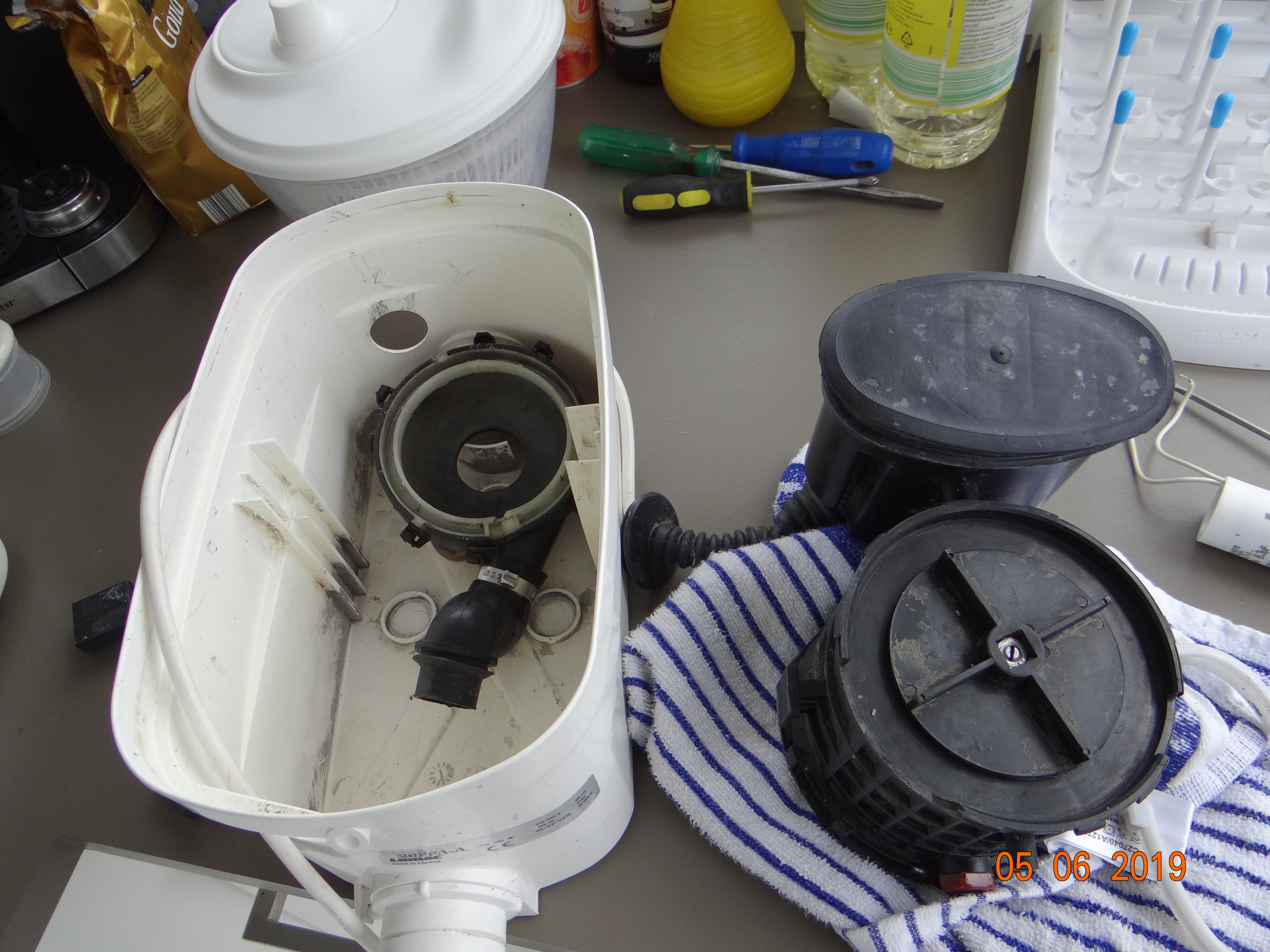 Na demontage en wat prutsen met het ding merkte ik dat de elektrische pomp niet op gang kwam, als je hem een zetje gaf deed ie het weer. In eerste instantie dacht ik dat ie door te weinig gebruik wat vast zat, maar op het internet kwam ik een berichtje tegen die de condensator als euvel noemde. Na verdere demontage van het elektrische deel van de pomp kwam ik een condensator van 6.3uF tegen. Op de website van Broyeurexpert zag ik de condensator genoemd in de lijst van losse onderdelen. Het leek dus een vaker voorkomend probleem te zijn. Condensator besteld voor 27.50 euro, ding er in, stekker in stopcontact en hij deed het weer. Probleem 1 opgelost.