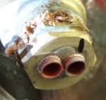 Nu was de druk volledig weg, eerst bijgevuld, maar zag al gauw een lekkage bij 1 van de pijpen in de CV, het drupte aardig. Het ging om een houder voor 2 sensoren, die met zo’n rode papieren pakking was gemonteerd. Deze was na 7 jaar gebruik spontaan gaan lekken. De houder verwijderd en nu met teflondraad als pakking weer gemonteerd. Ketel bijgevuld en er was weer heet water. Probleem 2 opgelost.