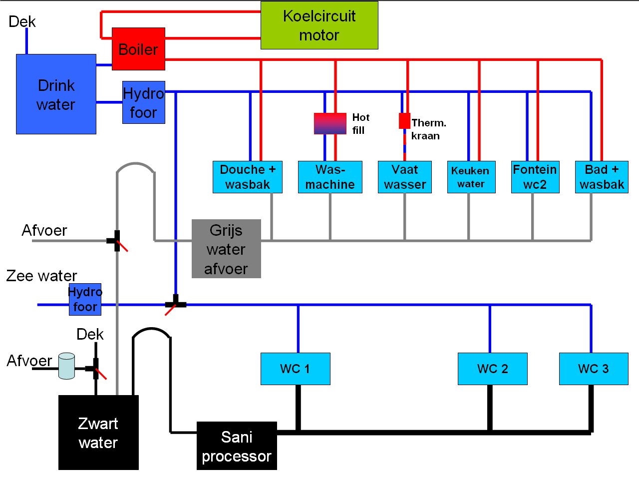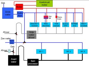 Nadeel is dat de vuilwatertank snel vol is omdat naast het toiletwater ook al het andere water er op afgevoerd wordt. Dus ook hier wil je eigenlijk een keuze voor scheiding tussen zogenaamd grijs en zwart water. Nu is er noodzaak voor iets vergelijkbaar met de SaniProcessor, maar dan voor grijs water (Vetus levert beide). Het concept is nagenoeg gereed, maar ik weet alleen nog niet hoe ik het zeewater bij de toiletten krijg. Hiervoor zou ik dan een 2de hydrofoor moeten gebruiken? Hieronder al aangebracht. Iemand betere suggesties?