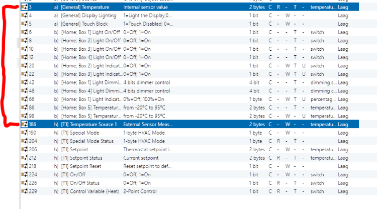 Tijd dus voor externe hulp. Gelukkig kon EIB-Logic mij verder helpen. Zij gaven de tip hoe ik de module om de CV te schakelen, moest koppelen aan de thermostaat van het Zennio Z38i touchscreen. Ook moest de interne temperatuursensor van het scherm worden gecombineerd met de bron van de temperatuur onder 1 groepsadres. De handleiding zorgde hier voor wat verwarring die uitgebreid beschreef dat er een aparte klimaat pagina op het scherm aangemaakt moest worden met veel parameters en instellingen. Nadat ik een enkele temperatuur knop op het scherm had aangemaakt en deze via een groepsadres had gekoppeld aan de setpoint van de temperatuur functioneerde het zoals het moest.