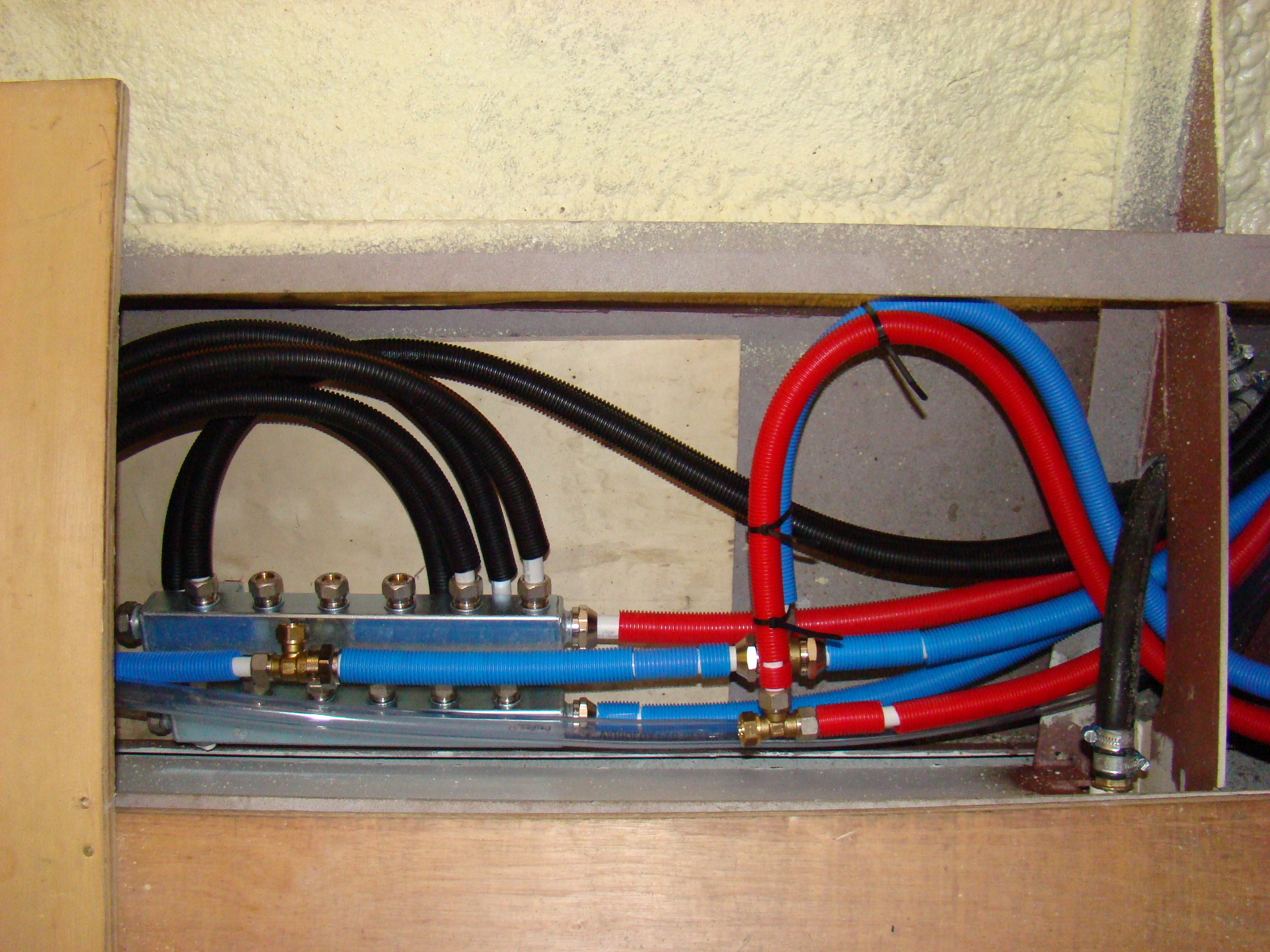 Het eerder beschreven concept voor de centrale verwarming (concept voor CV) is inmiddels uitgevoerd. Met 20 mm Uponor flexible buis is vanaf de CV een hoofdleiding naar een 6-groeps verdeler voor in het schip en een 6-groeps verdeler in de achterkajuit aangebracht. Voorlopig zijn op elke verdeler 3 tijdelijke radiatoren gekoppeld met 16 mm Uponor flexibele buis.