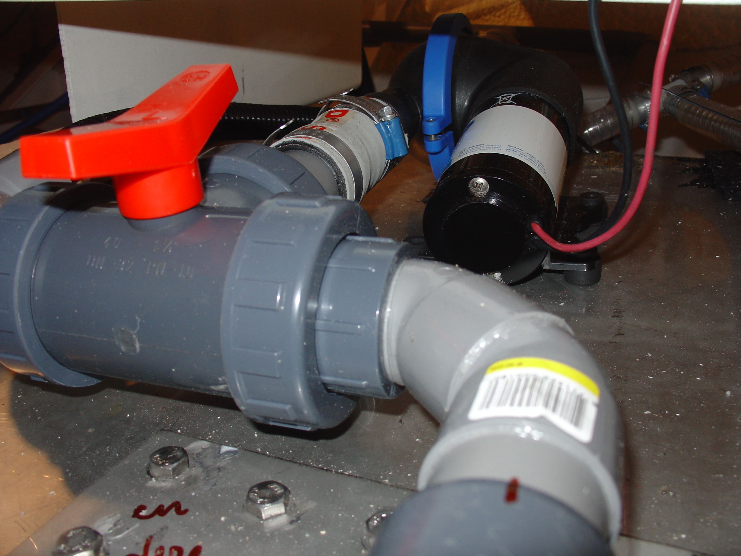 Bij de zwart water tank heb ik nu een diafragma pomp geinstalleerd om de tank zelf leeg te kunnen pompen via de standpijp in de motorruimte. Met een PVC 3-weg klep ertussen, kan ik de zelfde pomp gebruiken om eventueel de bilge in het voorste gedeelte leeg te pompen.