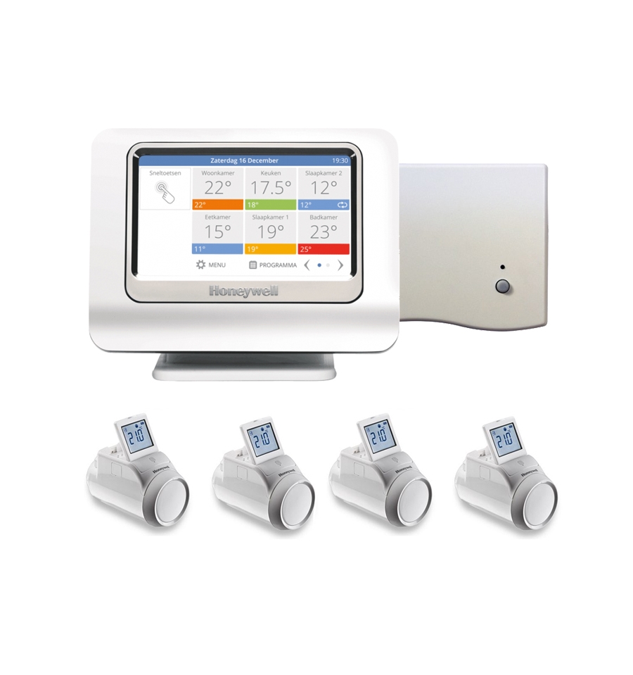 De installatie is redelijk eenvoudig. Heb je al thermosstaat knoppen op de radiatoren, dan vervang je die door de Honeywells. Verder een module aansluiten op je CV, draadloze verbindingen aanmaken tussen het scherm, de module bij de CV en de thermosstaat knoppen. Dan nog even de tijden en temperatuur programmeren en dan werkt het. Via het scherm kun je via een menu elke kamer bekijken of een overzicht van alle kamers en ook kun je tijdelijk de temperatuur in een kamer verhogen. Dat kan overigens ook met de draaiknop op elke thermosstaat knop. De verandering is dan geldig tot het volgende geprogrammeerde moment.