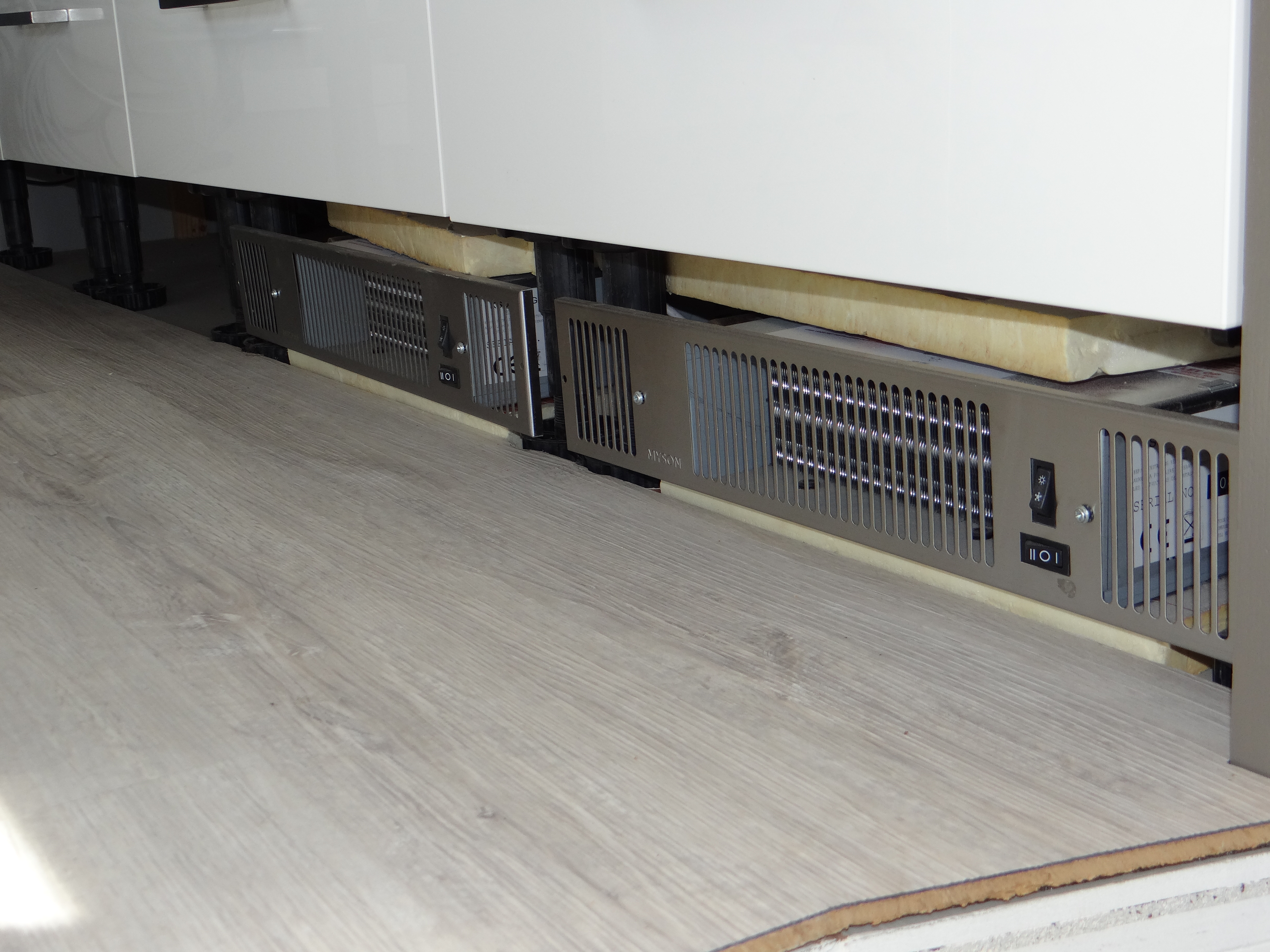 In de salon en keuken koos ik daarom voor zogenaamde plintverwarming. Mijn inschatting was dat deze mogelijk niet voldoende vermogen hadden en daarom wilde ik als extra in de TV-kast een 2-tal Jaga wandinbouw convectoren installeren. Deze zijn 2 weken geleden geinstalleerd. De warmte moet wel goed vanachter de kast naar boven gaan, volgens Jaga moeten de doorlaatopeningen daarom minstens 75 % bedragen. Via Ventilatieshop.nl heb ik een paar mooie ventilatieroosters gekocht en deze afgelopen week in de TV-kast geplaatst.
