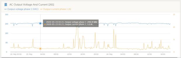Als ik de gemeten spanning van de Quattro zeven dagen terug volg, zie ik dat deze nergens onder de 241.3 V komt. Dit betekent dat de hoogte van de spanning van de walstroom in onze haven nooit onder de 230 V komt. Ik zie dus eigenlijk ook niet de noodzaak waarom de spanning van de scheidingstrafo standaard zoveel omhoog wordt gekrikt. Liever had ik een scheidingstrafo gehad waarbij ik dit zelf, afhankelijk van hoogte van de spanning van de walstroom, kan instellen. Weet iemand iets over een betere scheidingstrafo of is er iemand die andere suggesties heeft? Zelf zat ik te denken aan een spanningsregelaar die de te hoge binnenkomende spannning af vlakt, maar heb daar nog geen oplossing voor gevonden.