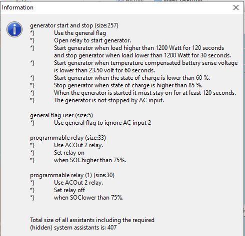 Iemand had al uitgedokterd dat je met de ‘general flag’ in combinatie met het ‘start/stop generator’ relais ook de walstroom uit en aan kunt zetten met dezelfde mogelijkheden als bij de Virtual Switch voor ‘dedicated Ignore AC’. Ik heb die assistant grotendeels gekopieerd en gecombineerd met de assistant voor AC Out 2. In bovenstaande assistant zie je hoe ik het nu voor elkaar heb gekregen dat de walstroom op de juiste momenten uit of aan is en de zware gebruikers op AC Out 2 stroom hebben, als de SOC van de accu hoger is dan 75 %.