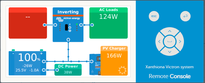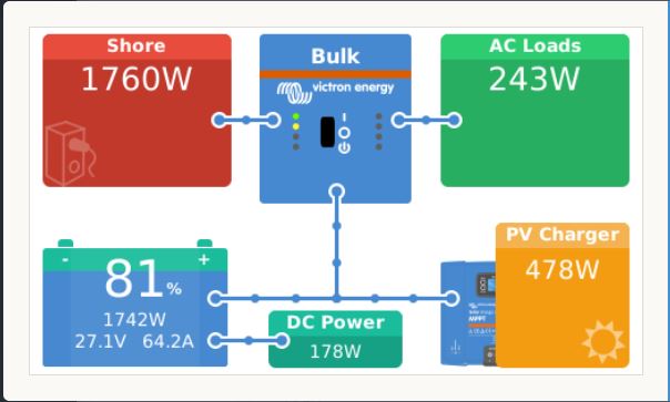 Hieronder zie je een screenshot met DVCC aan. Ziet er goed uit, panelen leveren 544 W en de walstroom laadt ook. Tevens is er nog verbruik van 226 W door 230 V apparatuur en 167 W van 24 V apparatuur.