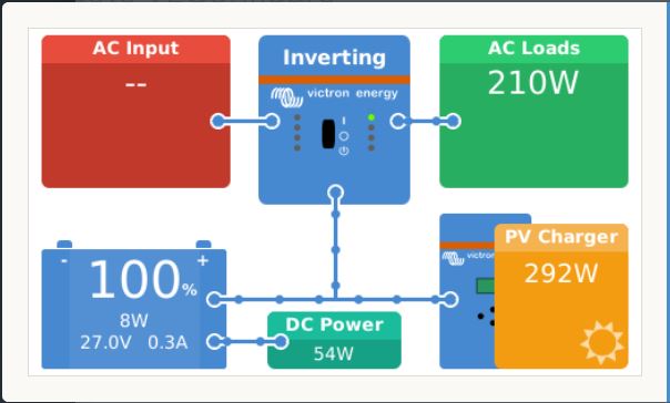 Er ontstaan 2 opties in het gebruik van de panelen: optie 1 is met gebruik van Virtual Switch en negeren van walstroom. De accu wordt over ca. 5-6 dagen tot 40 % ontladen en dan pas weer geladen door de Quattro tot 80 %. Is er weinig stroomverbruik en veel zon, dan laden de panelen door tot hopelijk 100 %. Bij optie 2 met gebruik van de instelling DVCC in de Venus GX, worden de accu’s permanent op 100 % gehouden. De Venus GX regelt naarmate er meer zonne-energie is, de Quattro minder laadt. Minder zon, meer Quattro.