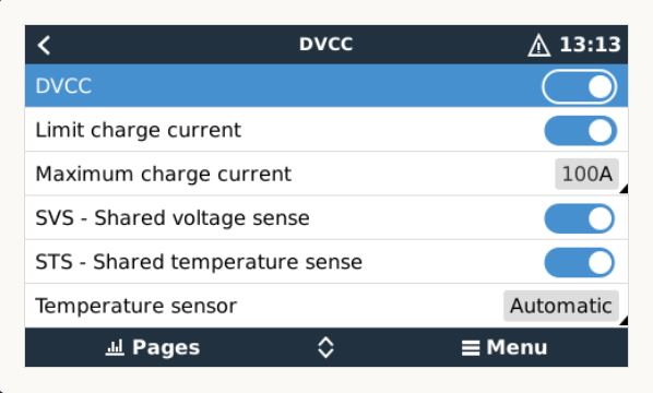 Het laden van de service accu kan nog slimmer. De Victron Venus GX functioneert als de centrale controle module in het 24 V elektrisch systeem en kan de Quattro en MPPT aan sturen. In de configuratie van de Venus GX is een instelling Distributed Voltage and Current Control (DVCC). Deze zet je aan en tevens zet je de maximale laadstroom op bijvoorbeeld 100 A. Nu regelt de Venus GX, dat als de panelen 20 A laden, dat dan de Quattro nog maar 80 A laadt. Is er minder zon en de panelen leveren minder, dan zorgt de Venus GX er voor dat de Quattro meer laadt. De accu wordt continue op 100 % laadtoestand gehouden.