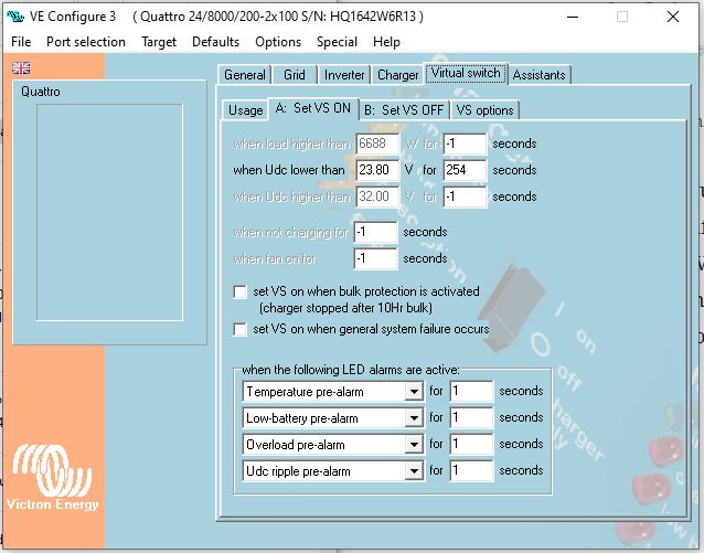 Om daadwerkelijk te besparen heb ik de walstroom uitgeschakeld, door de configuratie van de Victron Quattro 8000 via VE-Configure aan te passen. Dit is nu erg eenvoudig, omdat je via het portal van Victron Remote Management (VRM) het configuratie bestand van de Quattro op afstand kunt downloaden, aanpassen en weer kunt uploaden. Je schakelt de walstroom uit in VE-Configure, door een Virtual Switch (VS) te definieren, die bijvoorbeeld bij 23.8 V aan gaat en bij 25 V weer uit gaat. Als de VS aan is, wordt de AC (walstroom) niet genegeerd. Dus raakt de accu beneden de 23.8 V (ca. 40 % leeg) , dan gaat de walstroom de accu weer laden tot 25 V (ca. 80 % vol) en daarna nemen de panelen het weer over.