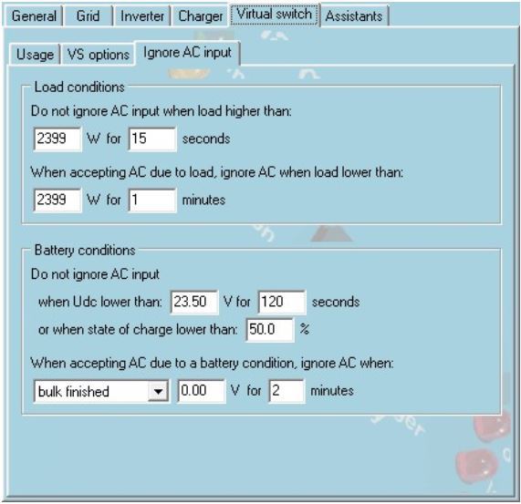Bij ‘dedicated Ignore AC’ kun je aangeven dat als er veel vermogen wordt gevraagd, dit niet uit de accu komt, maar toch rechtstreeks door de walstroom wordt geleverd. Bovendien kun je via dit tabblad in VE Configure ook instellen dat bij bijvoorbeeld een accuspanning van 23.5 V of bij een ontlaadtoestand van 50 % de walstroom niet wordt genegeerd. Een laatste mogelijkheid is bij het bereiken van bulk of absorptietoestand of bij een bepaald voltage de walstroom weer wordt afgeschakeld. Volgens het Ignore AC document, is het economischer om na het bereiken van de bulk toestand de walstroom weer af te schakelen, de absorptiefase duurt namelijk veel langer.