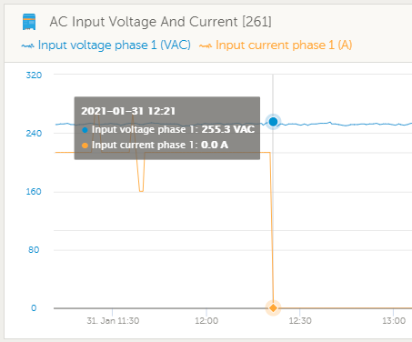 De Quattro stond sinds de vorige keer met veel alarmmeldignen, inderdaad ingesteld op afschakelen bij 255 V. Ik heb het nu toch nog maar wat naar beneden gebracht, nu is het 251 V. Dit zal misschien wel weer vaker als gevolg hebben dat de inkomende spanning van de Quattro wordt afgeschakeld en dus meer alarmmeldigen en vaker resetten.