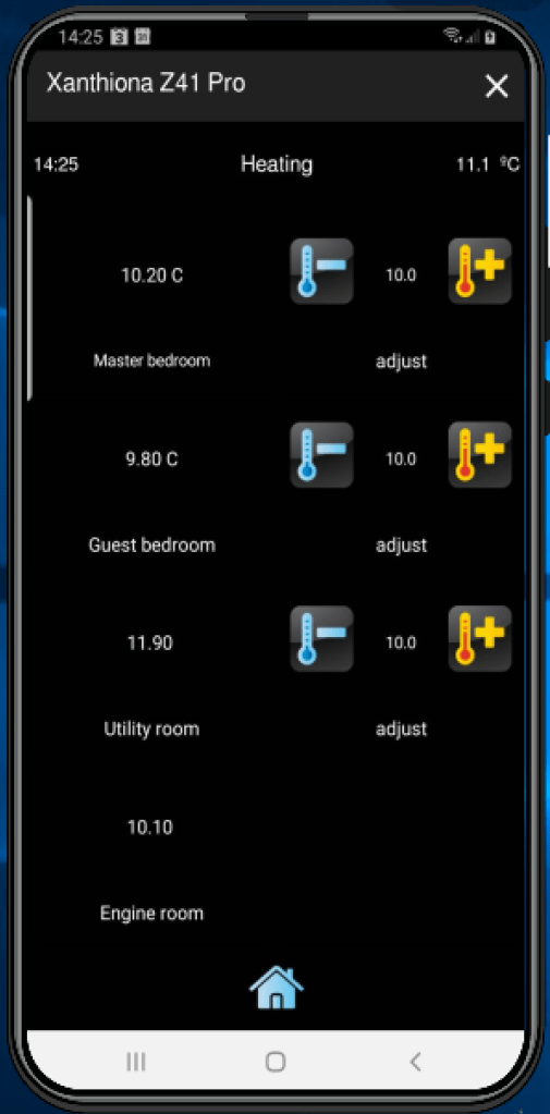 Voor de bediening van de lichten, het raam, de ventilatie en de centrale verwarming is een 230 V huisautomatiseringssyteem geinstalleerd dat werkt via het KNX protocol. Ik heb de werking hiervan al eens beschreven in de artikelen: centrale verwarming aangestuurd via KNX, verwarming per kamer geregeld via KNX en ventilatie per KNX. De bediening van alles gaat via programmeerbare touch screens (er zijn geen knoppen) en bewegingssensoren. Helaas kon ik op afstand dit systeem niet monitoren en bedienen. Onlangs heb ik daarom 1 van de touchscreens vervangen door een exemplaar die via een ethernet aansluiting nu aan de router hangt. Na wat programmeerwerk en het koppelen van de smartphone met het touchscreen kan ik nu op afstand de lichten uit en aan zetten, maar met name de centrale verwarming (per kamer) wat lager zetten. Na een dag klussen aan boord, kwam ik er thuis wel eens achter dat ik weer vergeten was de thermostaat lager te zetten bij het verlaten van de boot. Ik ben er wel eens speciaal voor terug gereden. Maar nu kan ik dat vanaf thuis of onderweg doen.