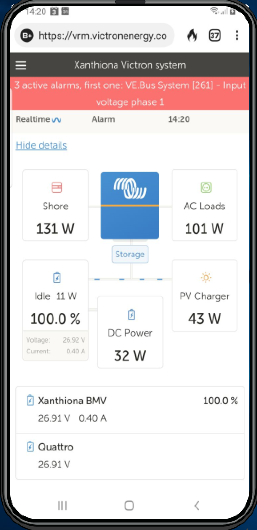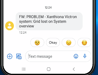 Het is niet zeker of alle 230 V apparatuur wel tegen deze hoge spanningen kan. Daarom had ik de Victron Quattro zo ingesteld dat deze bij een spanning hoger dan 255 V de binnenkomende spanning af schakelt om mogelijke schade te voorkomen. Dit resulteert dan in een alarm bericht ‘Grid lost’ op het Victron Remote Management (VRM) portal dat vervolgens een alarm-email stuurt. Omdat ik niet de hele dag mijn email lees en ook de ‘ping’geluidjes uit heb staan, laat ik de email automatisch doorsturen naar de Textmagic email-to-SMS service. Textmagic stuurt de binnengekomen email door als SMS, waarvan de ‘ping’ geluidjes wel aan staan. Dan weet ik dat er echt iets aan de hand is.