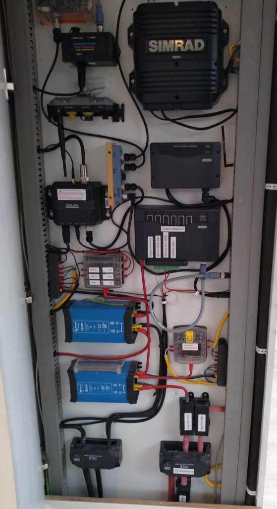 Op de volgende foto zie je alle apparatuur op het paneel in de keuken. Door de jaren heen is de hoeveelheid gegroeid en toen ik recentelijk de nieuwe Simrad RS90 black box marifoons wou installeren, moesten er eerst een aantal andere apparaten worden verschoven. Maar nu is het wel zo’n beetje compleet. Ik had de black box ook op een beschermde plek op de flying bridge kunnen installeren, maar vond de plek op het paneel in de keuken toch meer weerbestendig. Met als gevolg nog meer kabels die moeten worden doorgevoerd naar de flying bridge.
