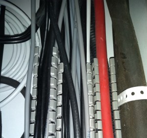 Al deze electronica en apparatuur wordt verbonden met elkaar via een heel assortiment van kabels. Het spanningsverlies over de totale lengte van een kabel bepaald met name de dikte van de kabels, zoals ik al eens beschreef in dit artikel: Amps, AWG, ISO en koffiedik kijken. De eerder genoemde ISO standaarden beschrijven ook voor een deel de kleur, het type, waar ze moeten worden geinstalleerd en hoe ze moeten worden afgewerkt. Zo moeten voor de 230 V AC kabels de bekende blauw/bruin en gele-groene aders worden gebruikt en voor 24 V DC alleen rood en zwart. Verder moeten AC en DC minstens 10 cm van elkaar gescheiden zijn en moeten de uiteinden van de kabels voorzien zijn van adereindhulzen. Tot zover de theorie over het georganiseerd en overzichtelijk aanleggen van een elektrisch systeem.