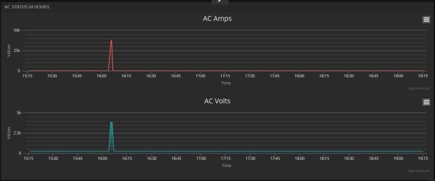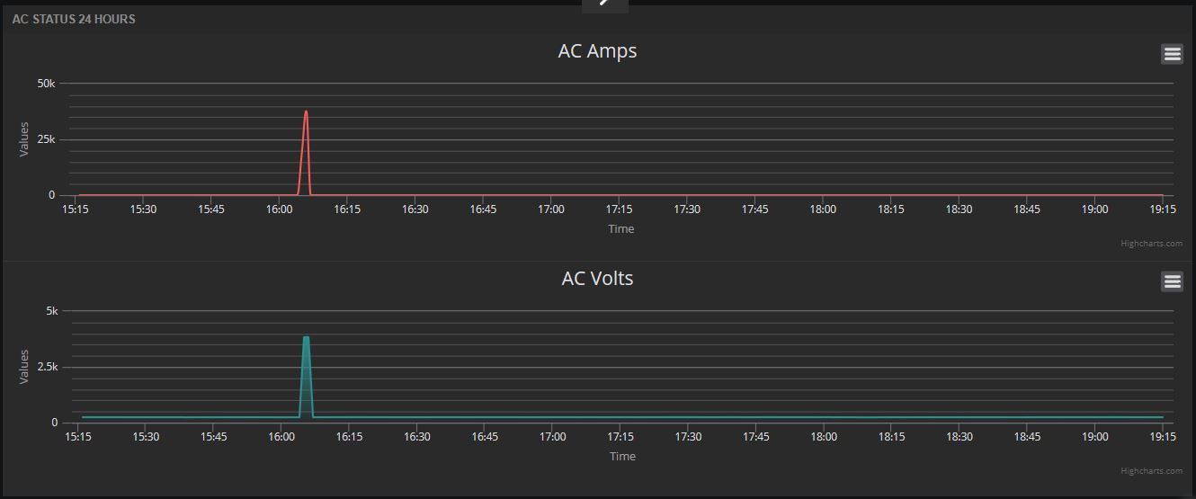 Vandaag keek ik nog eens vanaf thuis hoe het er voor stond op de Xanthiona en zag een enorme piek in de 230 V stroom en spanning: 40.000 Ampere stroom bij een spanning van ca. 4.000 V. Dit is in principe onmogelijk. Als deze waardes daadwerkelijk door de Victron Quattro gegaan zou zijn dan zou alle apparatuur nu volledig kapot zijn.