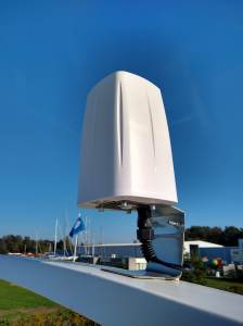 Om maximale 4G ontvangst te hebben tijdens het varen had ik vorig jaar al een 4G MiMo antenne met 12 dBi versterking op de radar beugel gemonteerd. De router maakt gebruik van MiMo (Multiple-Input, Multiple-Output) techniek voor 4G en wifi, waarmee de ontvangst van het 4G en wifi signaal wordt verbeterd. In de praktijk betekent dat 2 x een 4G antenne en 2 x een wifi antenne. De fraaie omni directionele LTE/4G antenne heeft 2 antennes in zich en dus lopen er ook 2 antennekabels van de radarbeugel naar de router in de kast.